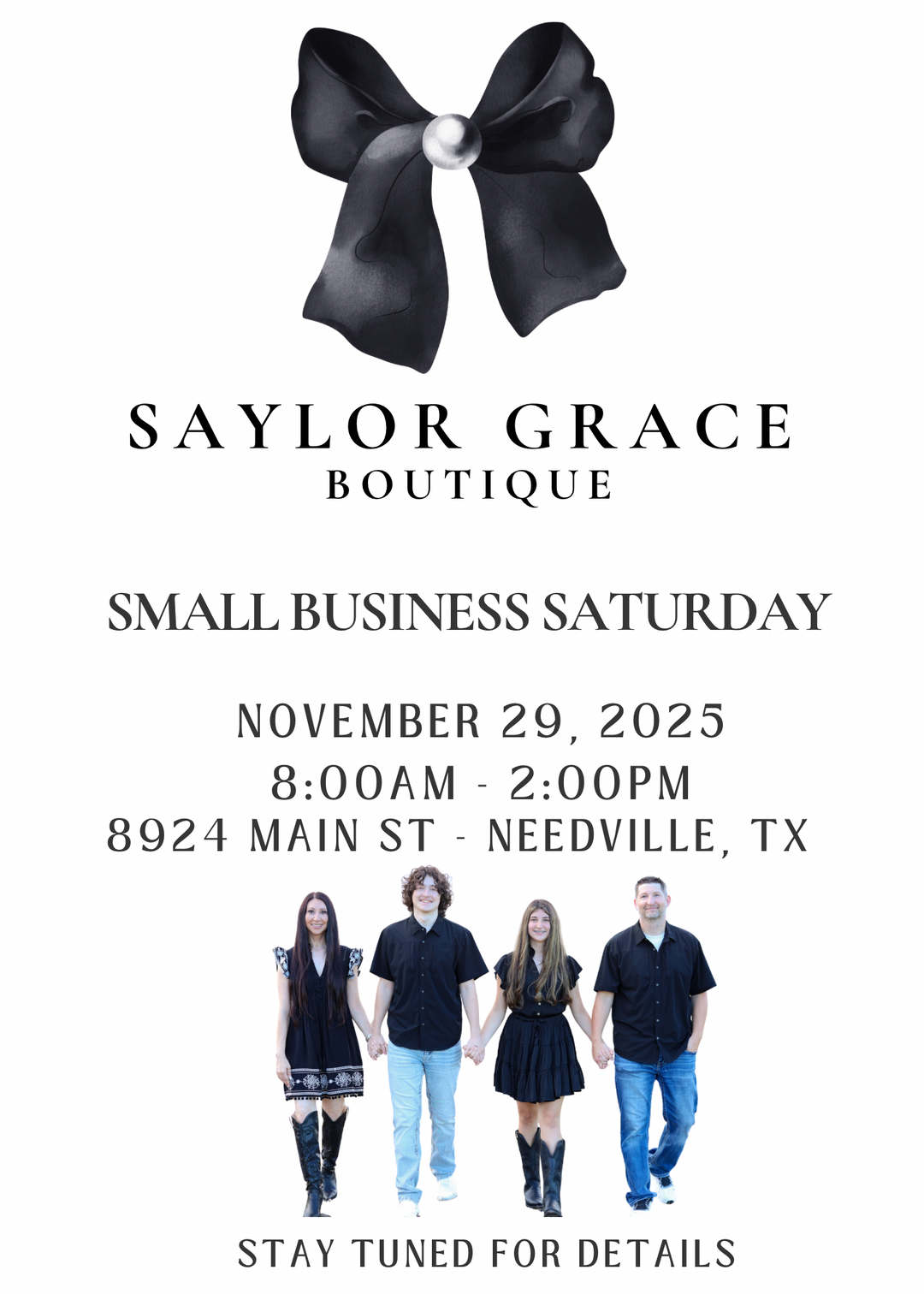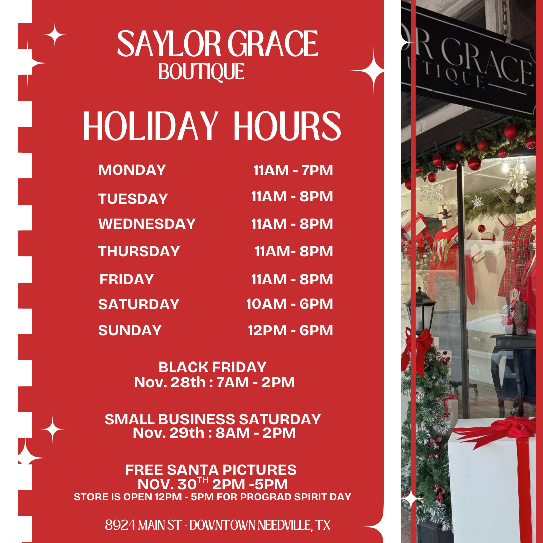 Hello SGB Family!! We are a Family owned small business. My husband and I along with our 2 kids, all play a special part in Saylor Grace. We are full of joy that you are here with us and love shopping with Saylor Grace! We love handing picking all the things for you and helping everyone feel amazing and confident! Saylor Grace started out our living room and has bloomed into an amazing Boutique because of YOU! We opened our first store front in our Hometown of Needville, TX on March 24, 2022!