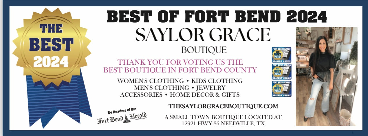 THANK YOU FOR VOTING US THE 2024 BEST BOUTIQUE IN FORT BEND COUNTY! 2 YEARS IN A ROW SAYLOR GRACE RECEIVE FIRST PLACE IN THE BEST OF THE BEST FORT BEND HEARLD READERS CHOICE! IN 2023 WE ALSO WON BEST BOUTIQUE AND 2022 WE WON BEST NEW BUSINESS IN FORT BEND COUNTY! THANK YALL SO SO MUCH!