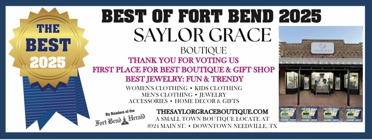 THANK YOU FOR VOTING US THE 2025 BEST BOUTIQUE AND GIFT SHOP IN FORT BEND COUNTY AND FIRST PLACE IN FUN & TRENDY JEWELRY! 2023-2025.....3 YEARS IN A ROW SAYLOR GRACE BOUTIQUE RECEIVE FIRST PLACE IN THE BEST OF THE BEST FORT BEND HEARLD READERS CHOICE!