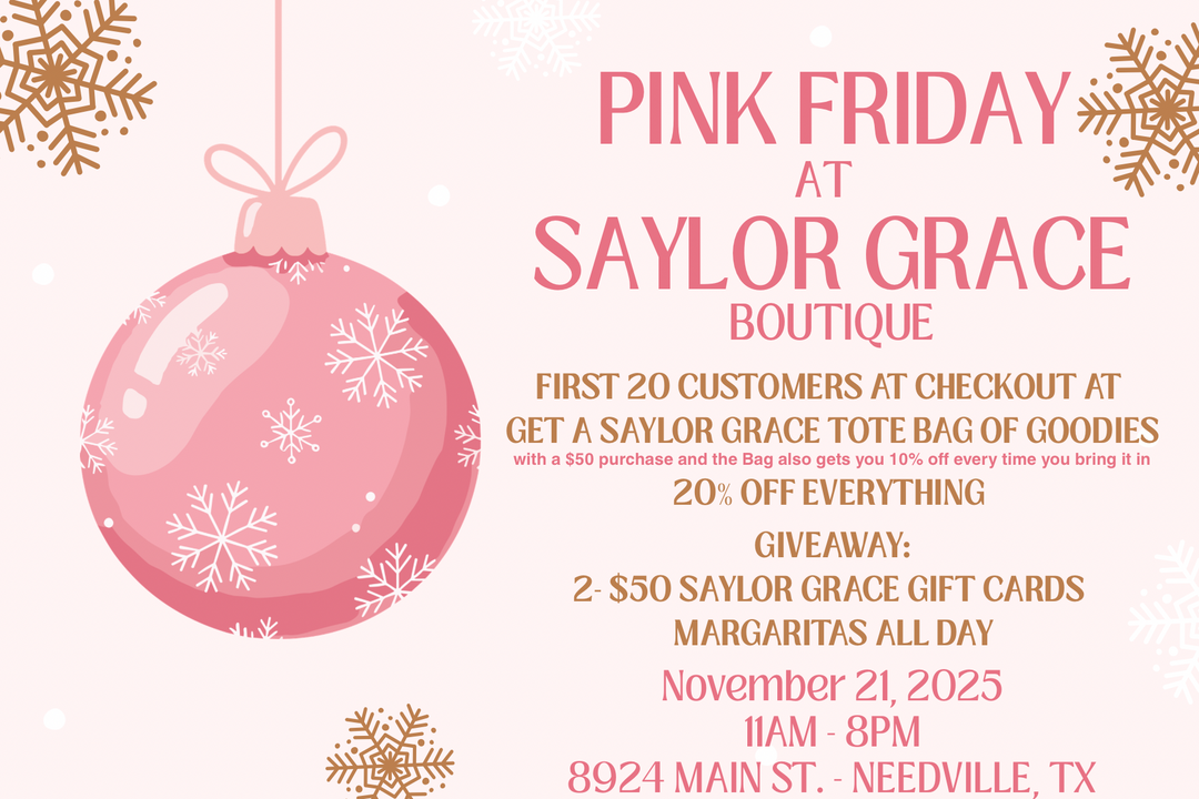 HERE AT SAYLOR GRACE, WE HAVE NEW ARRIVALS DAILY! WE ARE YOUR ONE STOP SHOP IN! WE HAVE SOMETHING FOR EVERYONE HERE AT OUR SMALL TOWN BOUTIQUE IN THE OWNERS HOMETOWN OF NEEDVILLE, TX! WE CARRY NEWBORN - YOUTH KIDS, WOMEN'S AND YES MENS!! WE ALSO HAVE A WIDE VARIETY OF HOME DECOR AND GIFTS. ALL ITEMS ARE HAND PICKED BY THE OWNERS, ALOT OF TIME AND THOUGHT GO BEHIND EVERY ITEM IN SGB!!