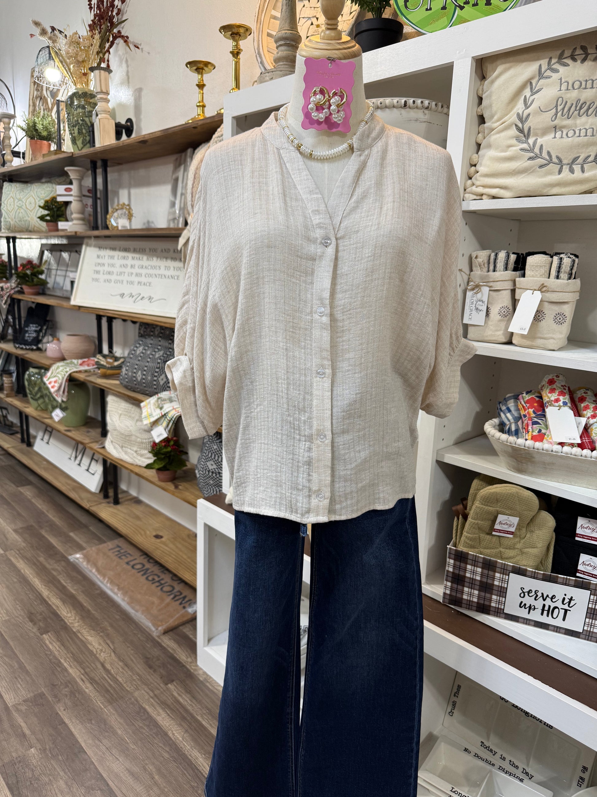 The Anna Top brings effortless elegance with a modern edge. This linen-like shirt features a chic China collar Y-neckline and relaxed elbow dolman sleeves that feel as good as they look. The crisp pinstripe pattern adds visual interest while keeping things sophisticated. Lightweight and breathable, it's perfect for layering or wearing on its own—ideal for transitioning from office to weekend adventures with style to spare.