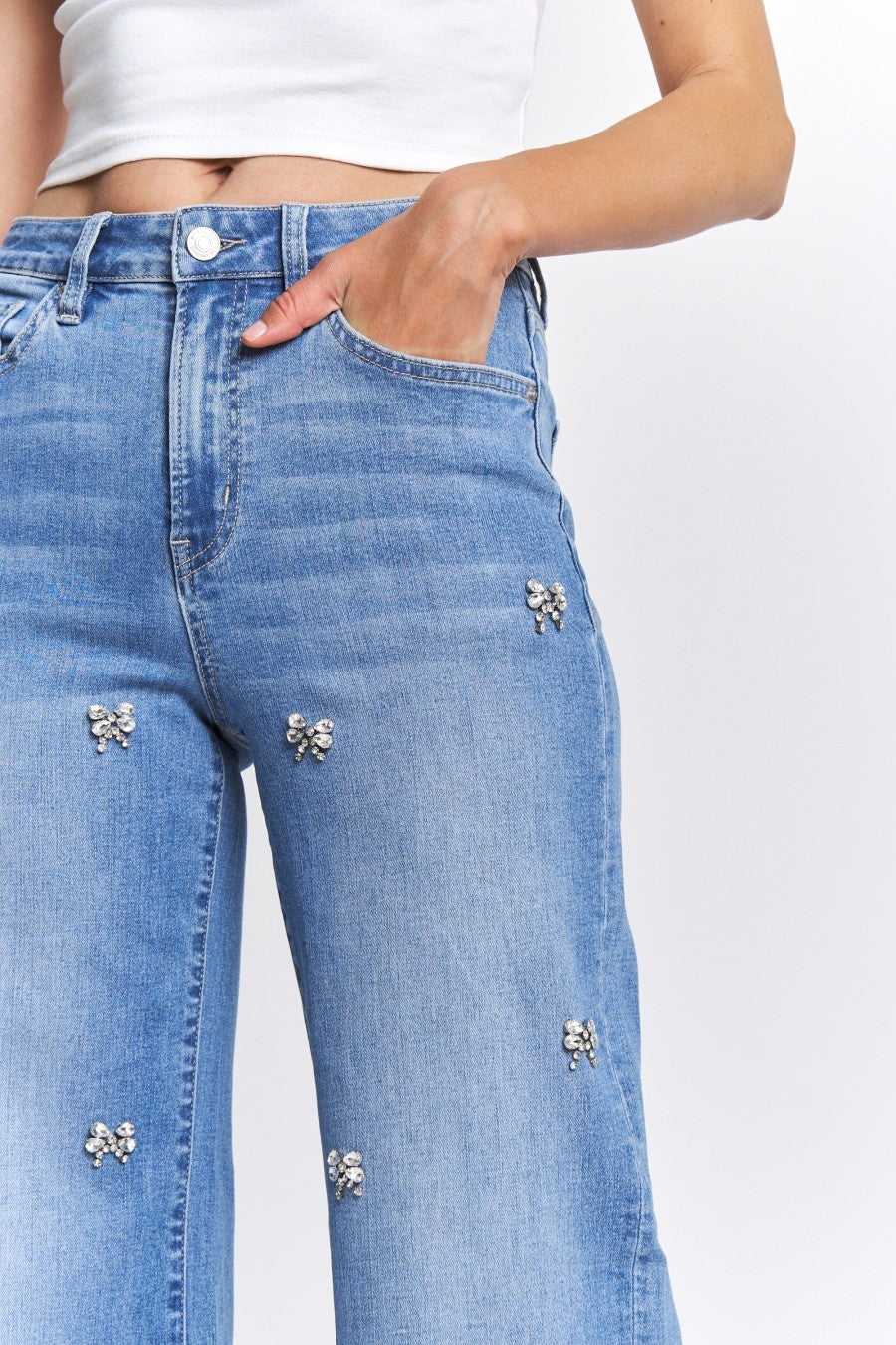 Step into sparkle and sass with these show-stopping wide-leg jeans featuring a gorgeous bow rhinestone embellishment. Perfect for turning heads at any occasion, these jeans blend comfort with glamorous flair. The relaxed wide-leg silhouette flatters every figure while the dazzling rhinestone bow detail adds that extra touch of personality and pizzazz. Whether you're dressing up for a night out or elevating your everyday look, these jeans are your new go-to for making a statement.