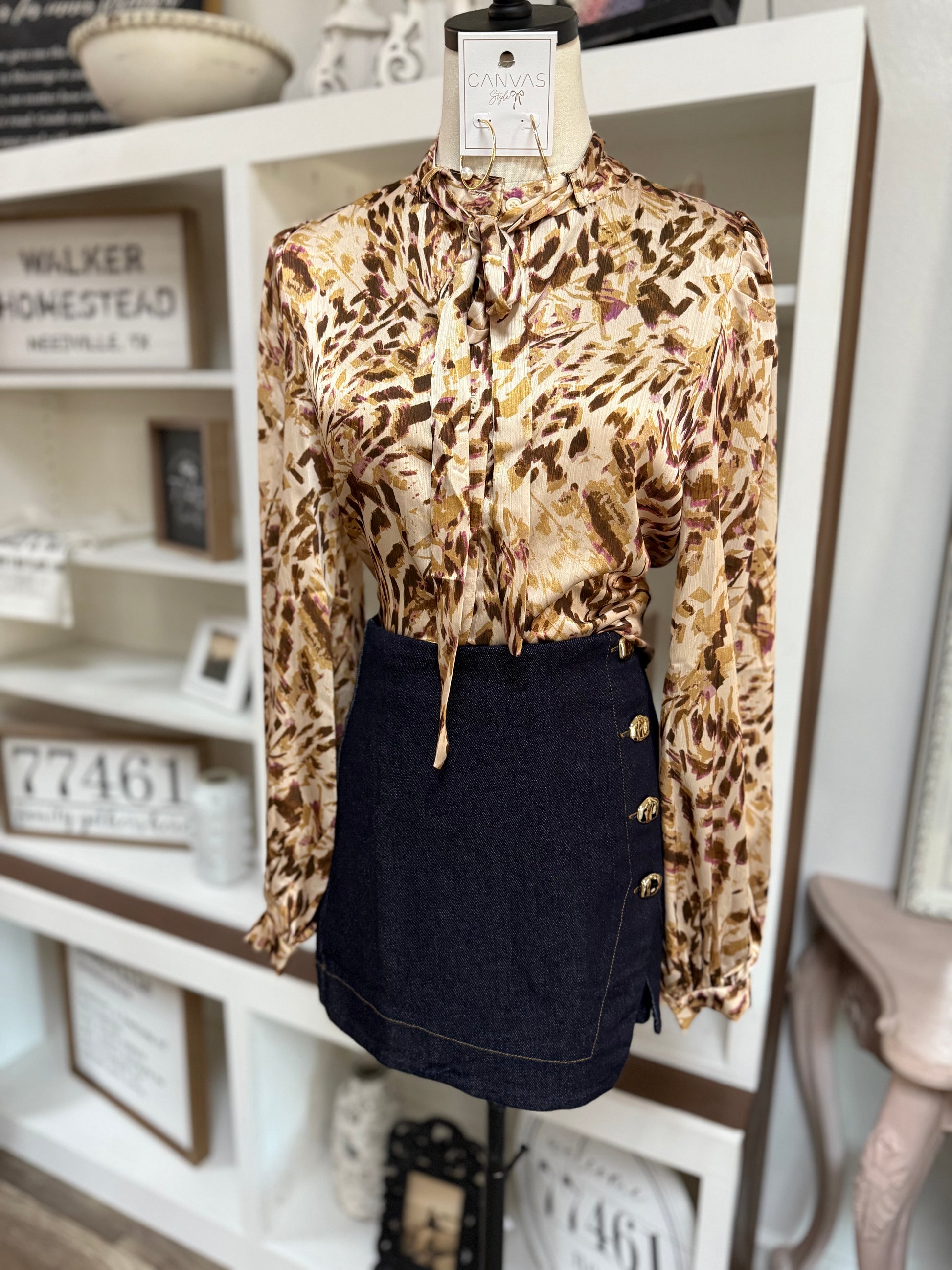The Breanne Top is your new go-to for effortless style with a playful twist. This printed woven beauty features a charming round neckline adorned with a skinny tie, paired with convenient button-down styling. The long blouson sleeves add movement and dimension, creating a flattering silhouette that works from brunch to date night. Mix and match with your favorite bottoms for endless outfit possibilities.