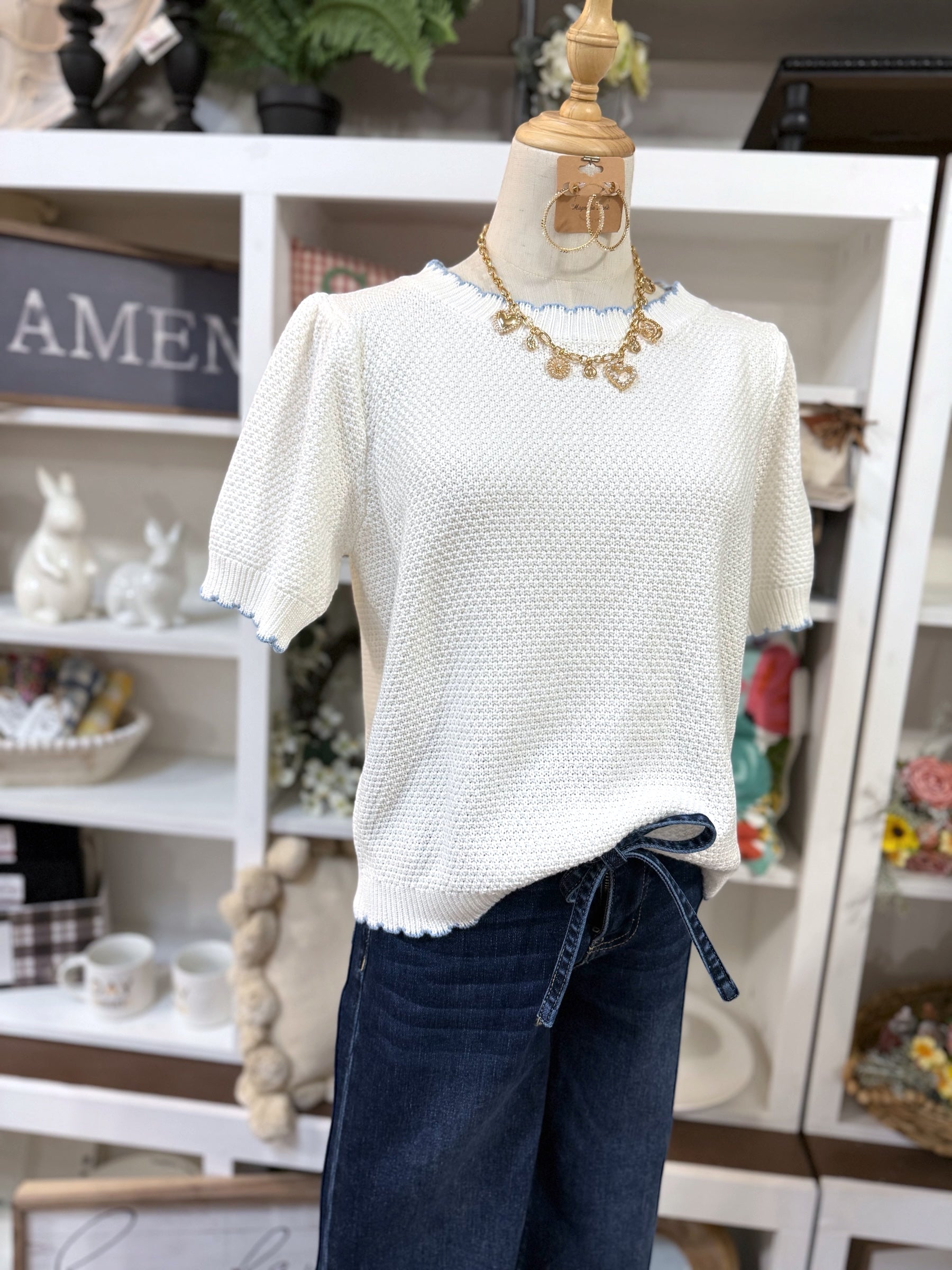 Introducing the Ellie Top—your new go-to for effortless charm! This cozy sweater features adorable puff shoulders that add instant personality, paired with short sleeves perfect for layering or solo styling. The delicate scallop edge accent along the hem brings a sweet, feminine touch that sets it apart. Whether you're dressing up for brunch or keeping it casual, the Ellie Top delivers comfort without compromising on style. A playful essential that works as hard as you do!
