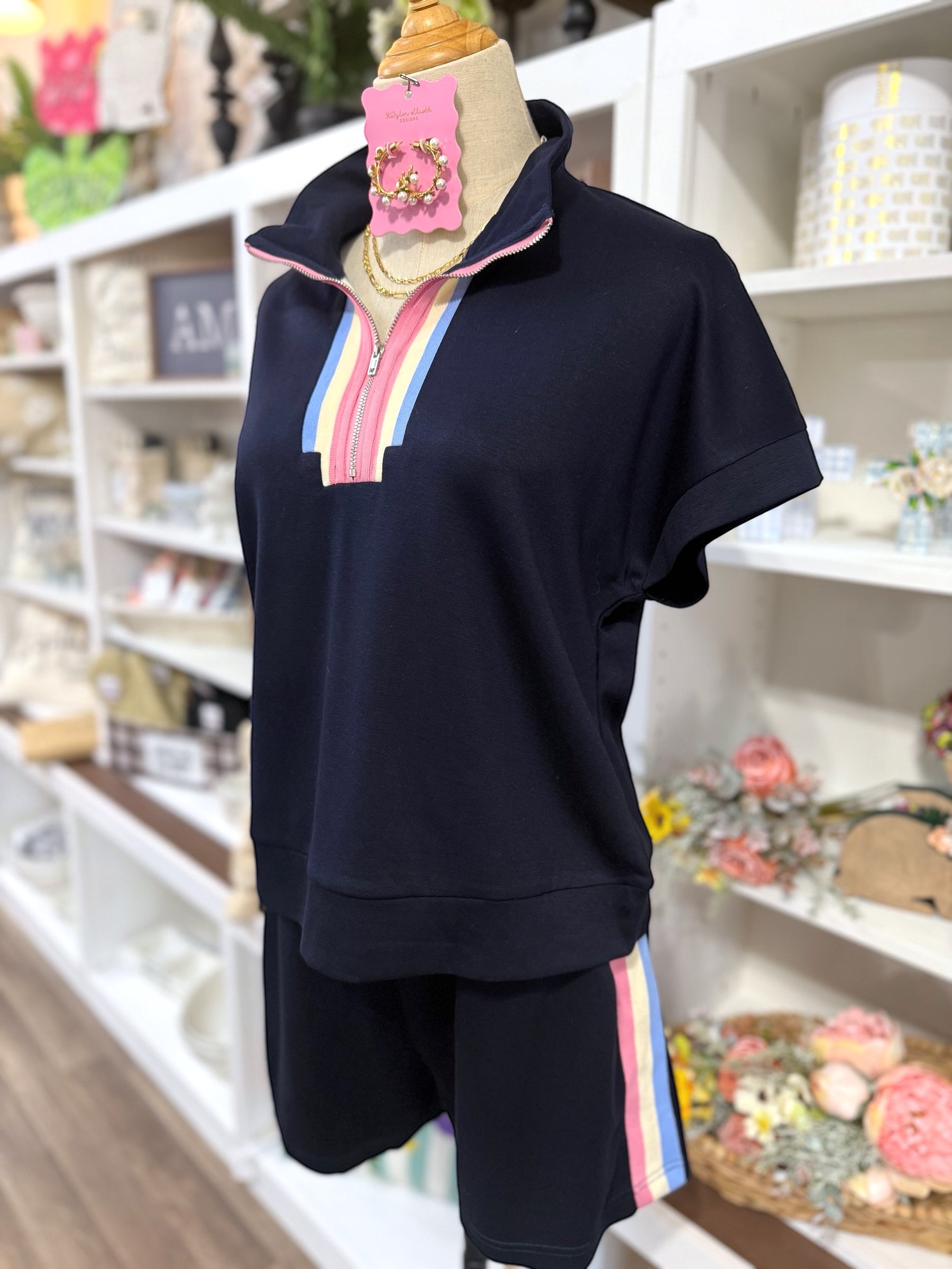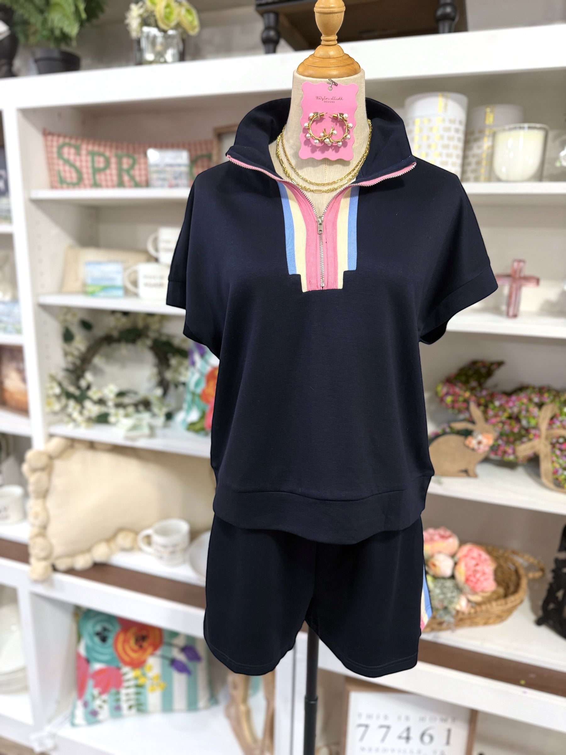 Meet the Emmy Set—comfort meets style in this laid-back two-piece combo! Featuring a relaxed drop-shoulder zip-up top paired with drawstring waist shorts, this set is all about that effortless vibe. The playful color band accents add just the right pop of personality to keep things interesting. Whether you're lounging at home or running errands, the Emmy Set delivers cozy-chic energy that makes getting dressed feel like a breeze. Mix, match, or wear as a set.