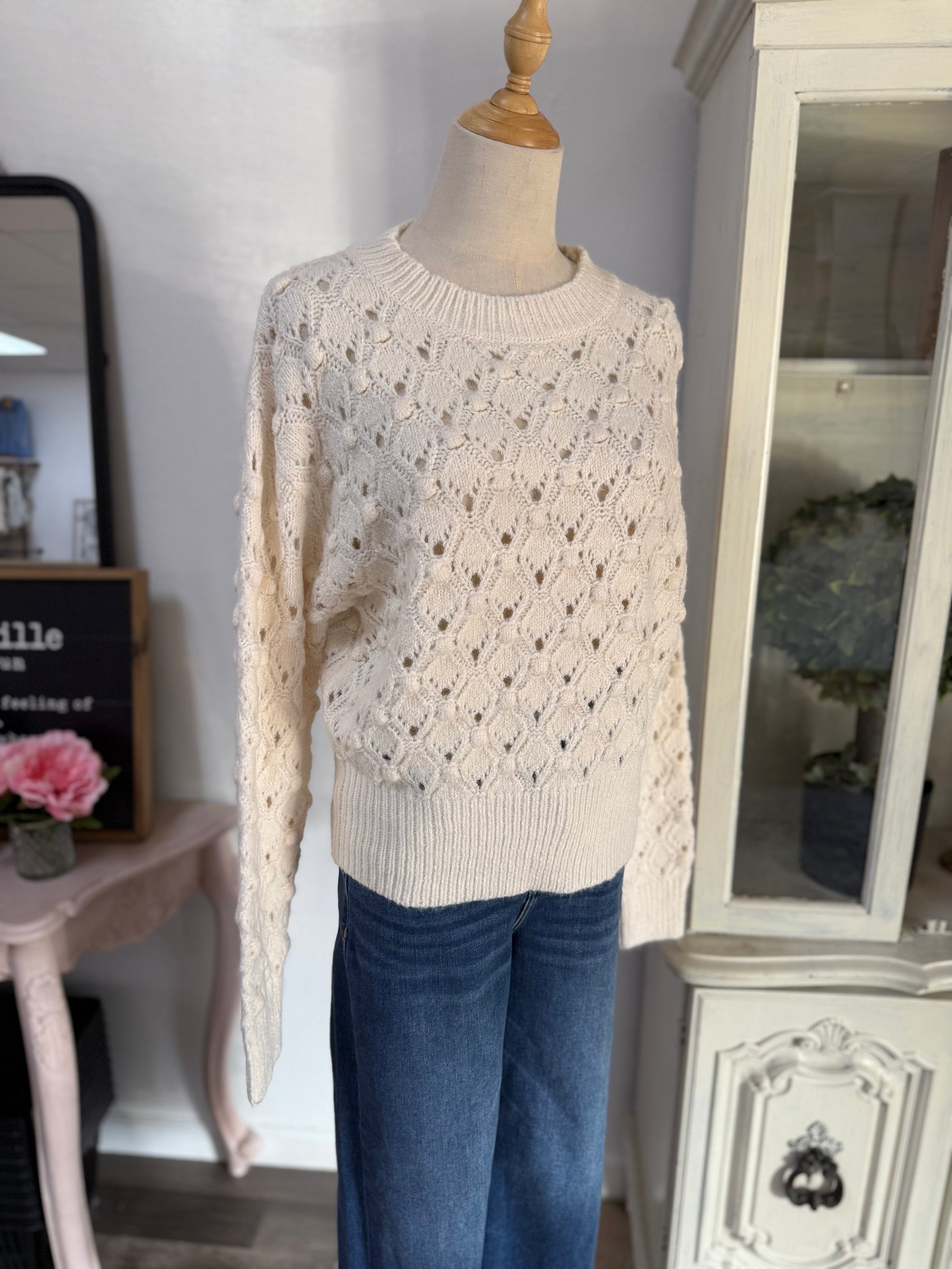 The Gina Sweater is a finely crafted long sleeve pointelle top that combines delicate knit detailing with expert tailoring. Its breathable fabric and intricate patterning offer both comfort and a refined aesthetic, making it an ideal layering piece for sophisticated wardrobes. Perfect for transitional seasons, this sweater balances style and functionality with precision.