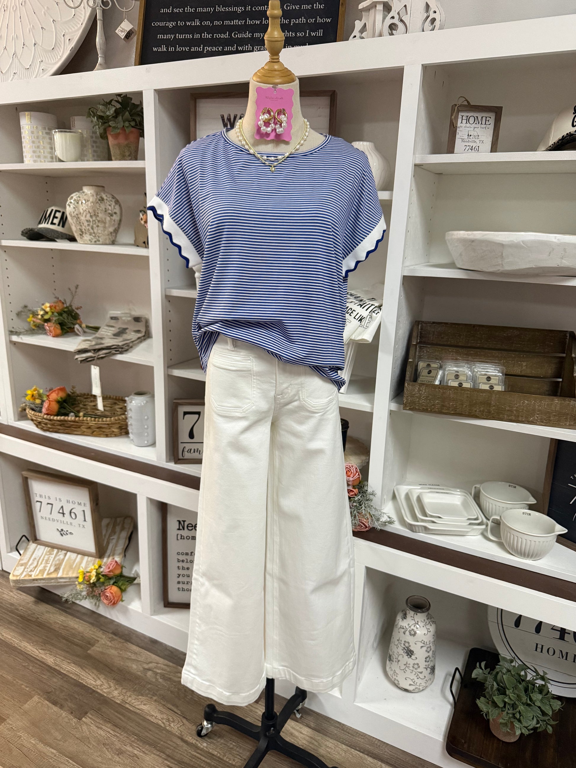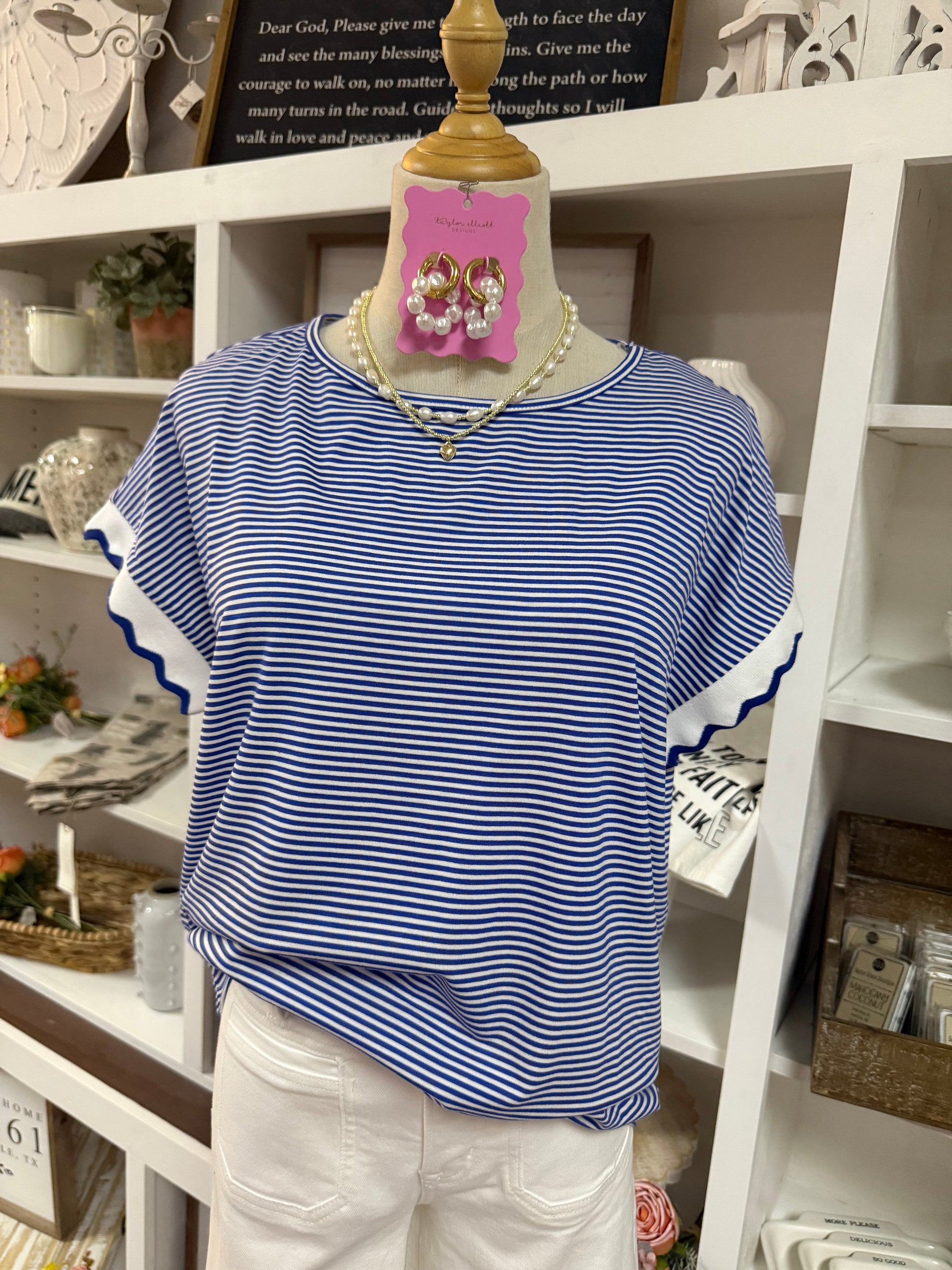 Introducing the Hollie Top—where timeless pinstripes meet playful details. This short sleeve jersey top features a charming scallop edge hem that adds a touch of whimsy to a classic silhouette. Soft and stretchy jersey fabric moves with you, while the refined pinstripe pattern keeps things sophisticated. It's the perfect blend of comfort and style—dress it down with denim or elevate it for a night out. A versatile piece that proves the best looks are the ones that feel effortless.