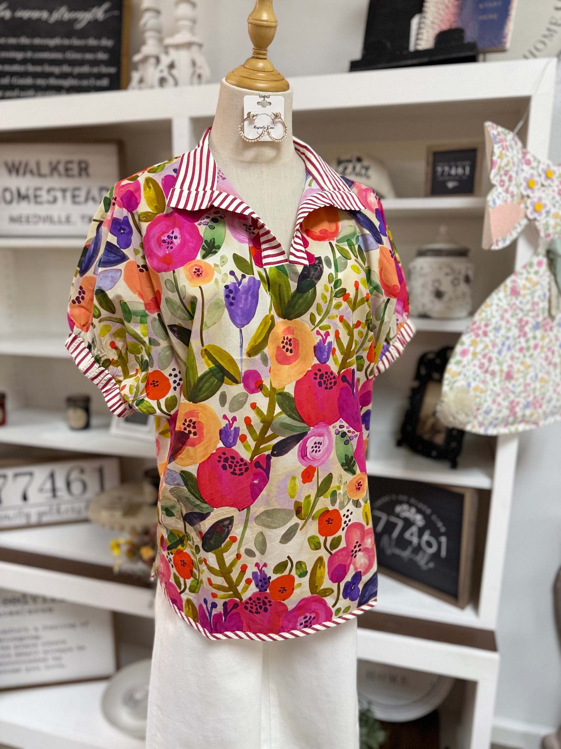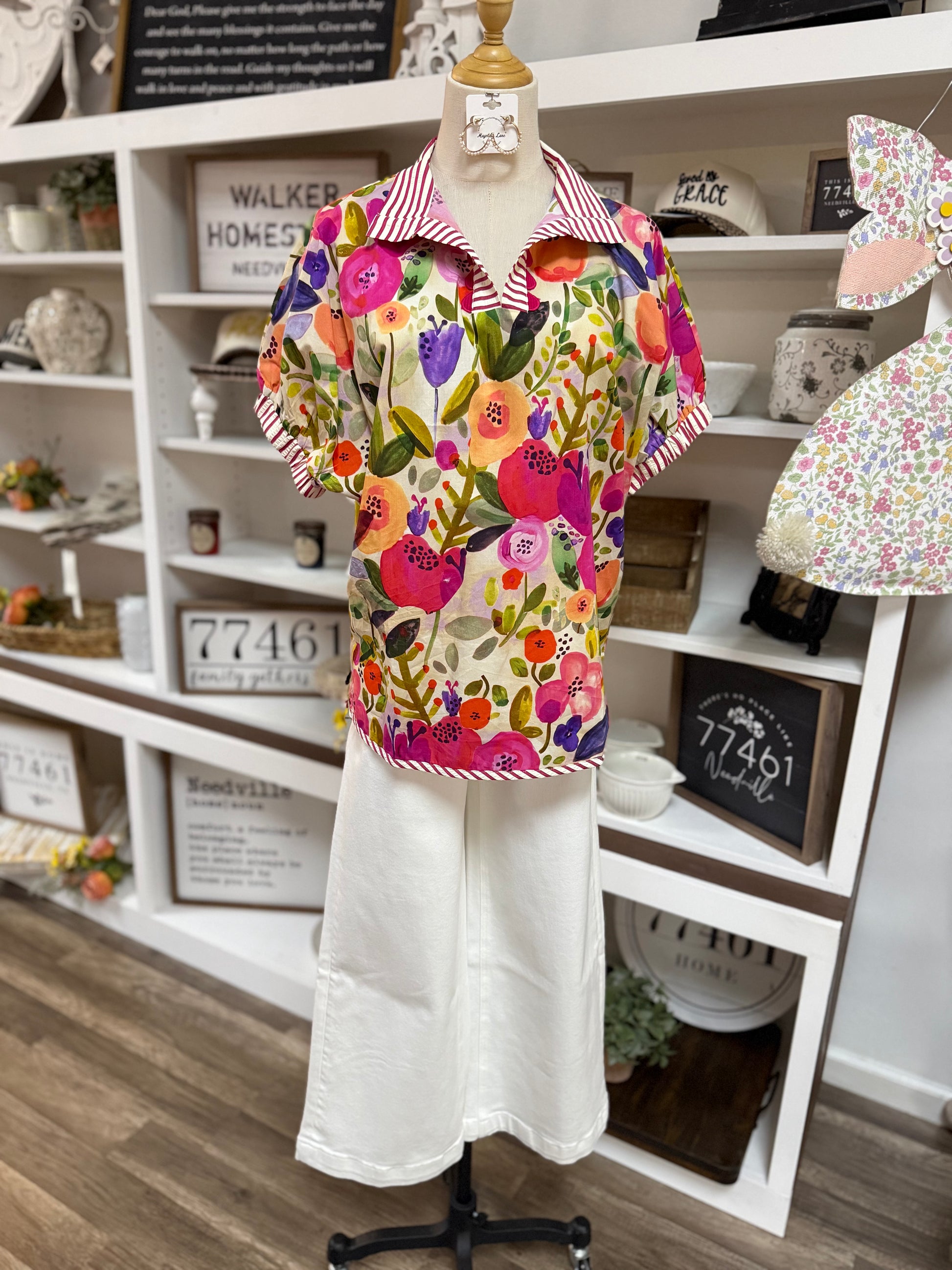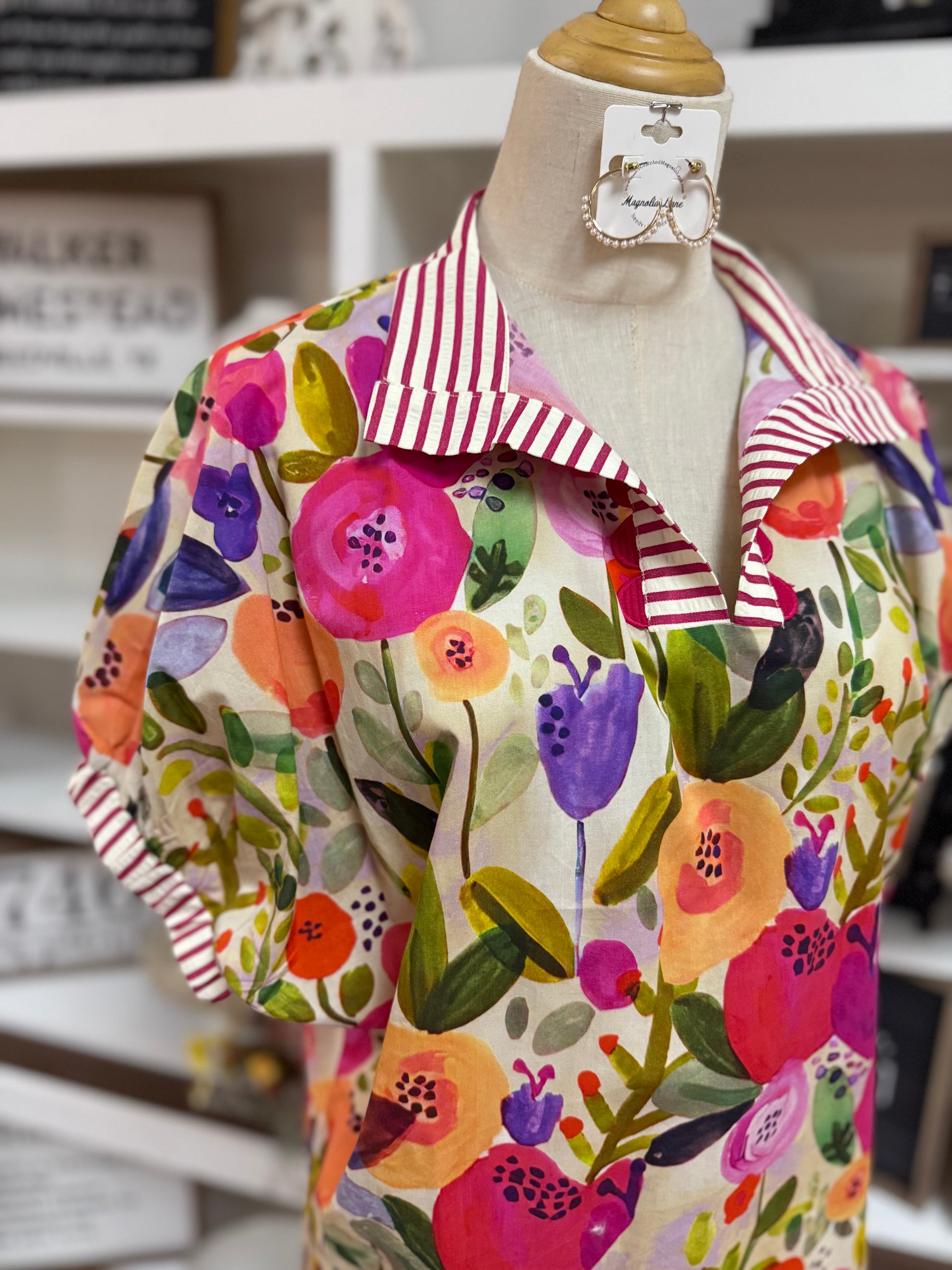 Say hello to the Jennie Top—a blooming beauty that's ready to brighten your day! This delightful floral top features a cozy mock-neck design paired with eye-catching stripe accents that add just the right amount of visual pop. Decorative trim details elevate the look with a touch of sophistication, making it perfect for mixing and matching with your favorite bottoms. Whether you're keeping it casual or dressing it up, the Jennie Top brings playful charm and effortless style to every occasion.