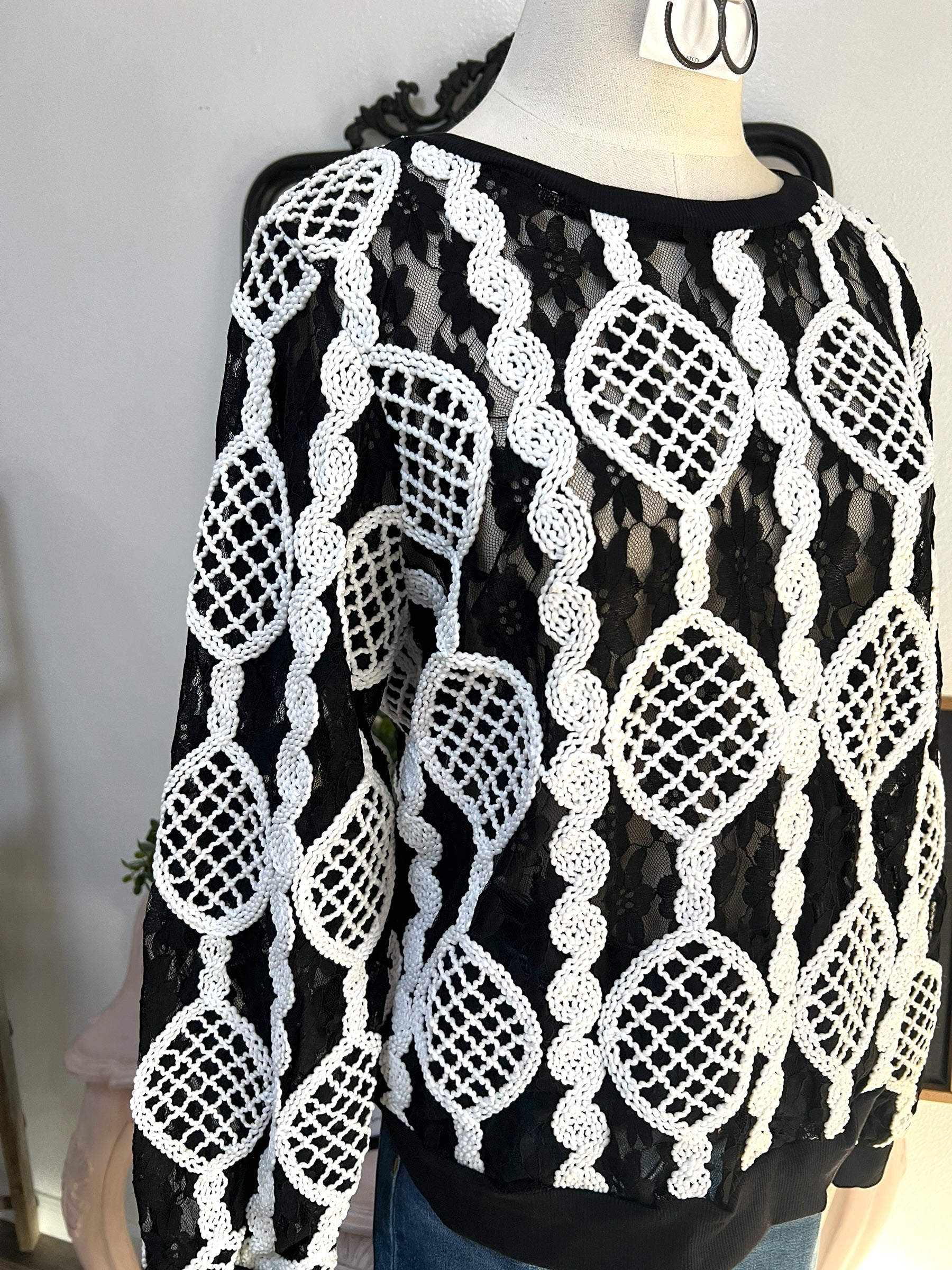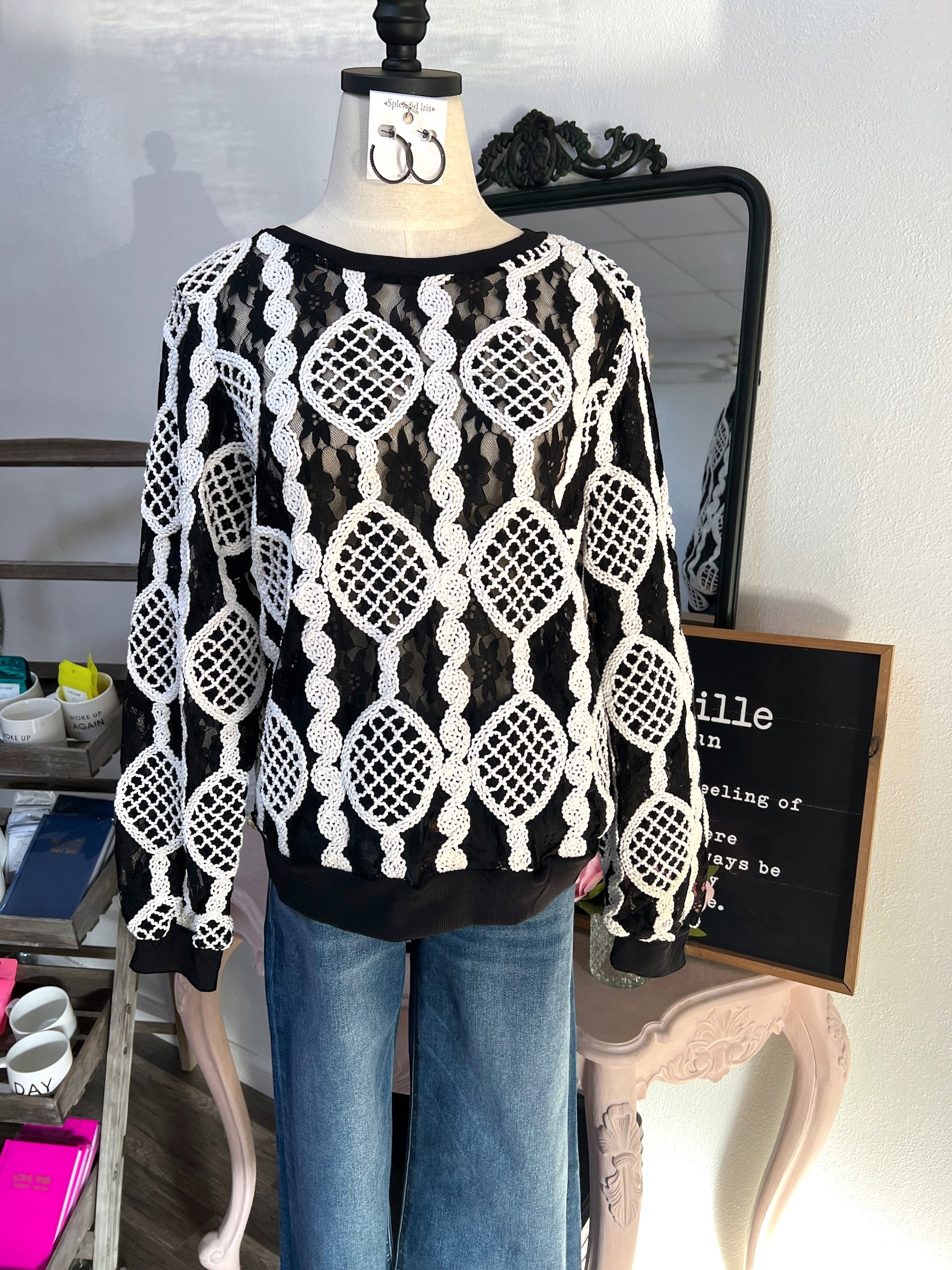 The Nikki Top features intricate lace and trim detailing on long sleeves, combining delicate craftsmanship with a refined silhouette. Designed for a flattering fit, this top offers both elegance and versatility, suitable for layering or wearing alone. Its sophisticated design and quality construction make it a standout piece for elevating your wardrobe with expert style.