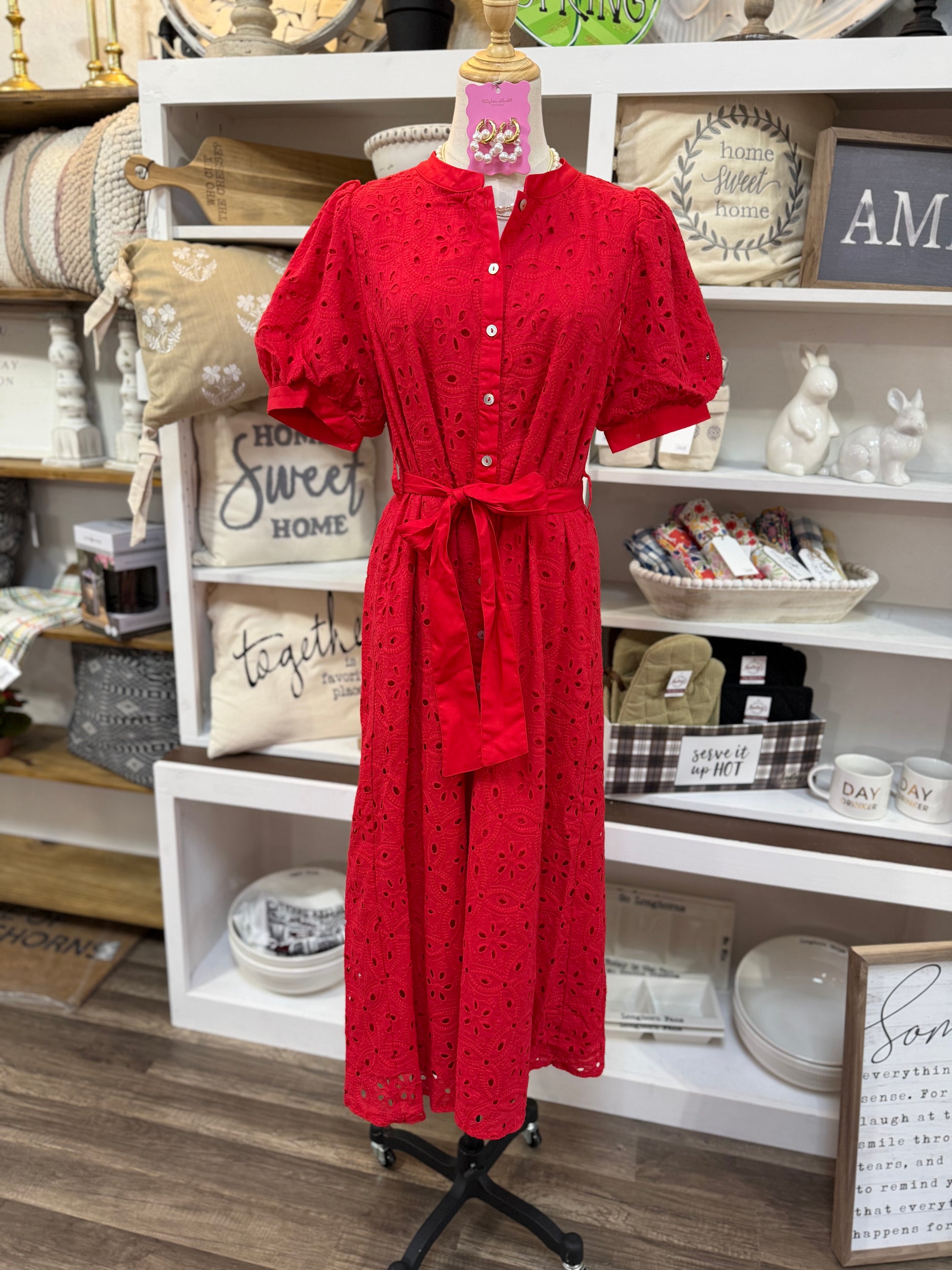 Introducing the Reba Dress—your new go-to for effortless charm! This eyelet midi features adorable puff sleeves and a button-down front for easy styling. The cinched waist tie creates a flattering silhouette, while practical side pockets keep your essentials close. Perfect for brunch dates, garden parties, or whenever you want to feel put-together with a playful twist.