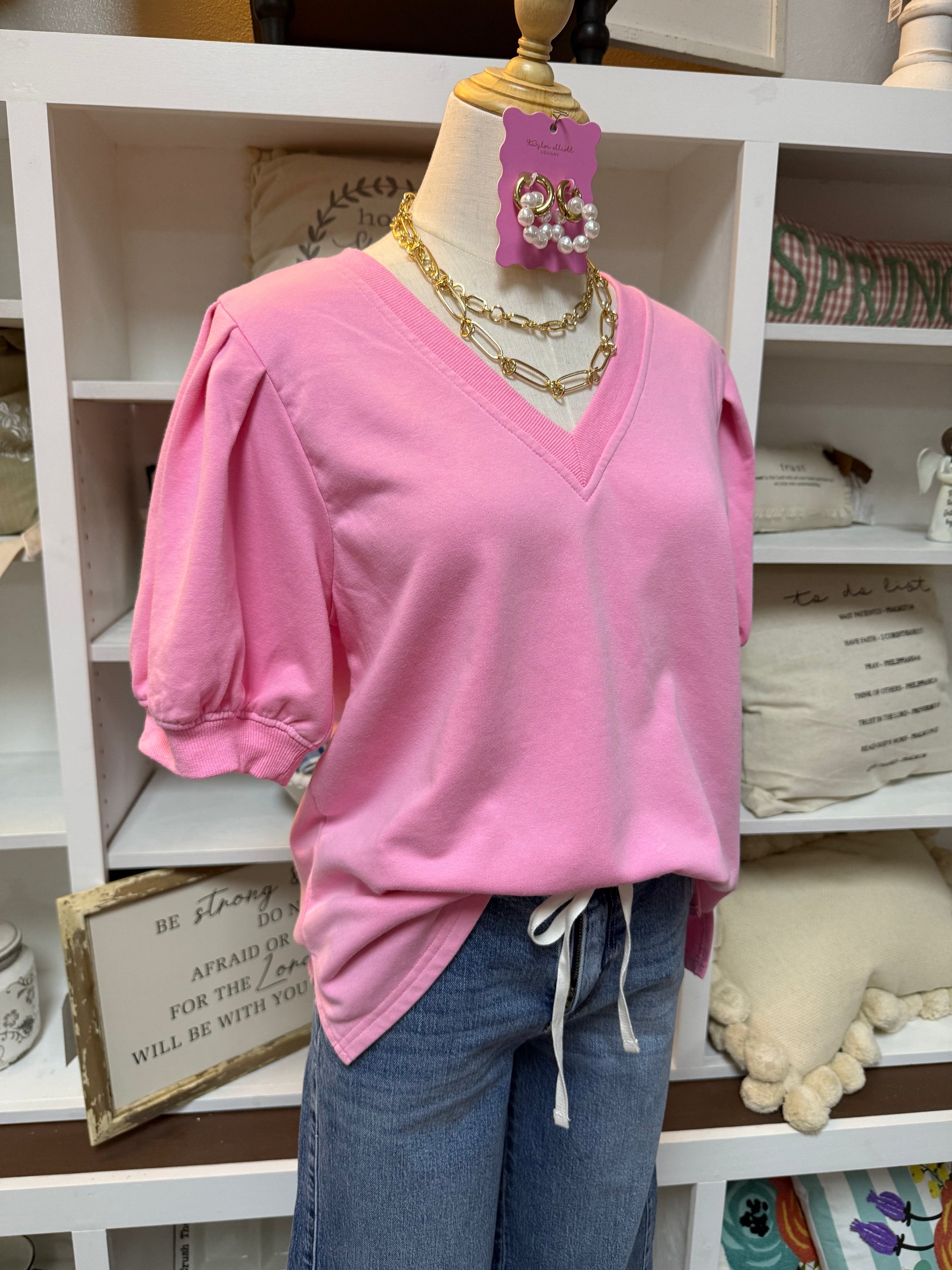 Meet the Sandra Top—a charming cotton essential that's anything but basic. The flattering V-neck pairs beautifully with adorable pleated puffed sleeves that add just the right amount of personality, while band cuffs keep things polished. A mineral-washed finish gives it that perfectly lived-in, effortless vibe, and the vented hemline ensures you'll stay cool and comfy. Whether you're dressing it up or keeping it casual, this top is ready for whatever your day throws at you.