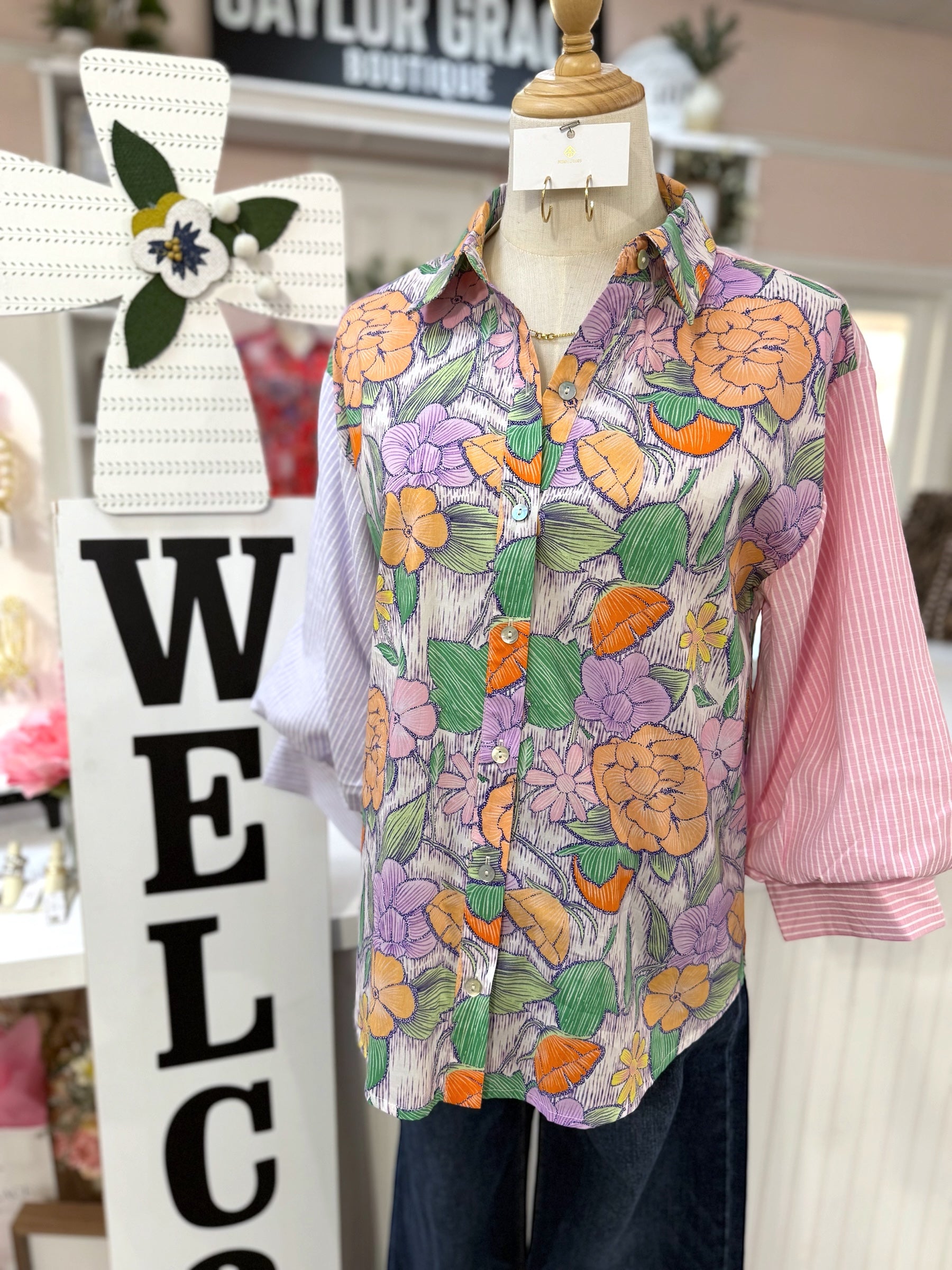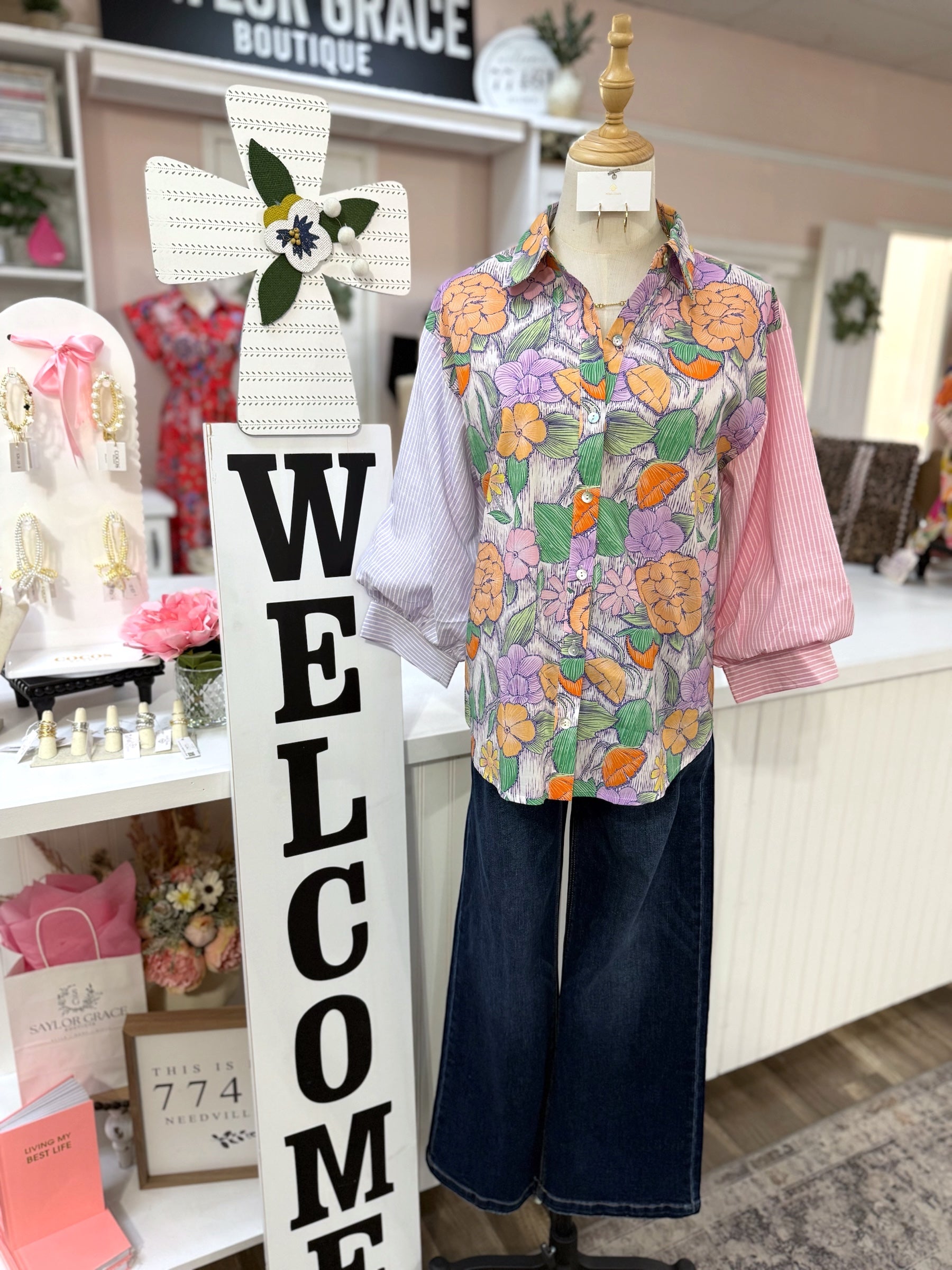 Introducing the Sophia Top—your new go-to for effortless style! This charming button-down features playful 3/4 puff sleeves that add just the right amount of drama, while the mixed fabric design blends delicate florals with crisp stripes for a look that's anything but boring. Mix, match, and make it yours. Perfect for layering or wearing solo, the Sophia Top brings personality to every outfit.
