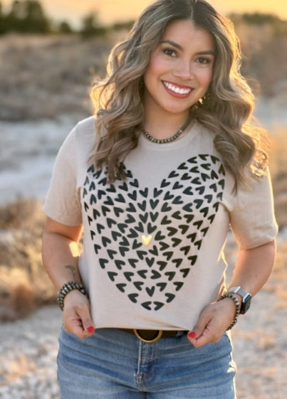 Adorable tiny hearts shimmer with gold foil accents on this charming black tee, arranged in a sweet heart shape. Perfect for expressing your love of all things cute, this versatile piece works for casual outings, cozy nights in, or whenever you want to add a touch of sparkle to your wardrobe. A timeless favorite that's impossible to resist!